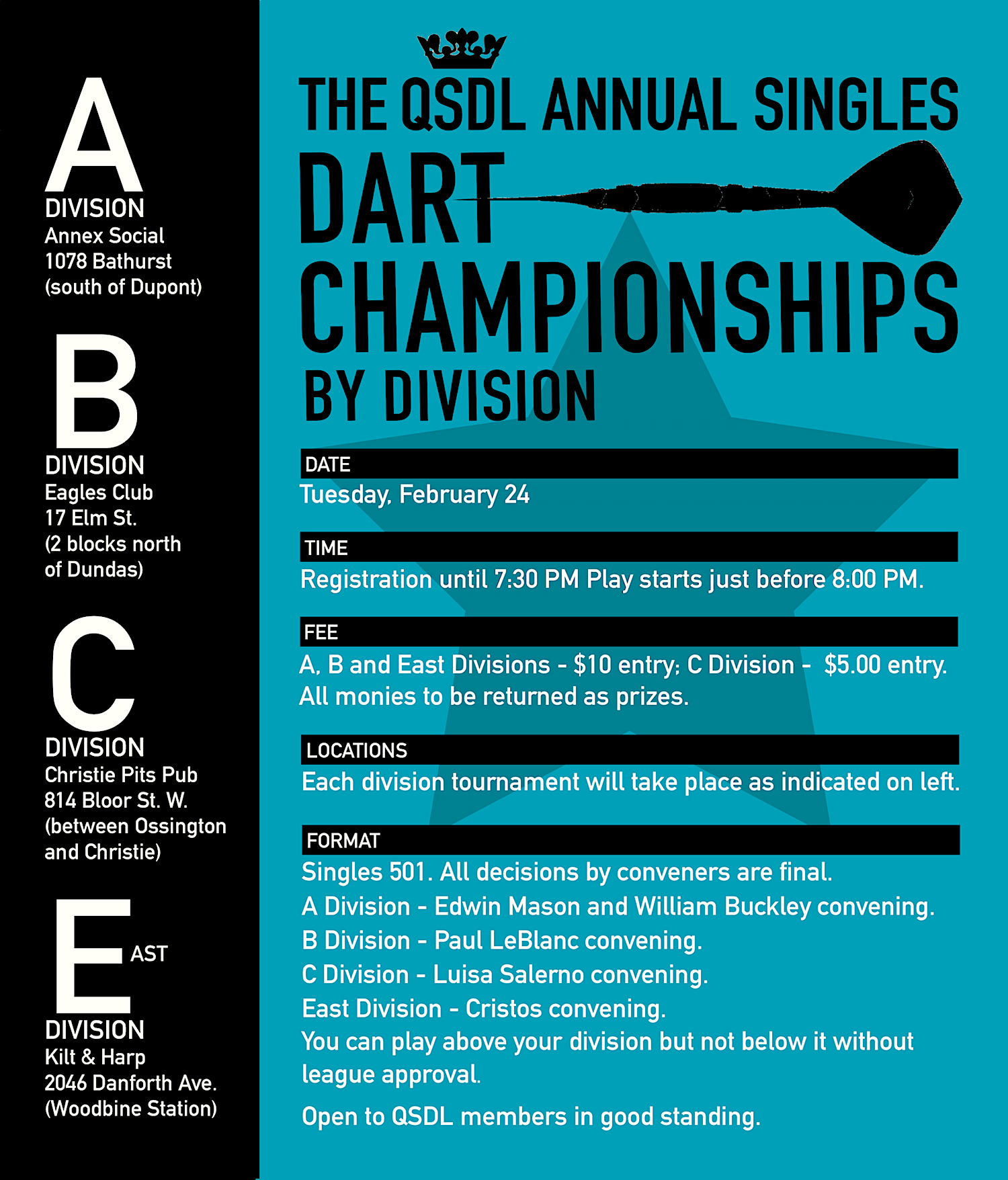 The Aerie will host the QSDL Annual B Division Singles Dart Championship Tournament on February 24. All B level QSDL members are welcome! For information concerning A, C ,and E division locales see above information graphic.