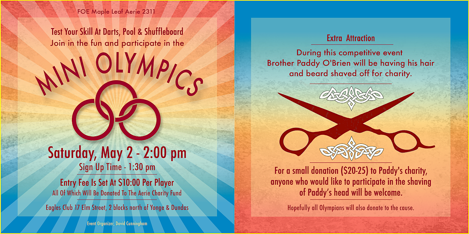 The Mini Olympics are back! The event will last for approximately 3 hours. Half of all funds collected will be donated to the the Aerie Charity Fund. All members and guests are welcome. For a fun afternoon of darts, pool and shuffleboard com'n down.